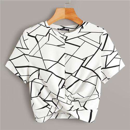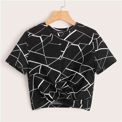 SHEIN Twist Hem Cross Wrap Hem Geo Print Crop Top Women Summer Casual Slim Fit Blouse Short Sleeve Womens Tops and Blouses